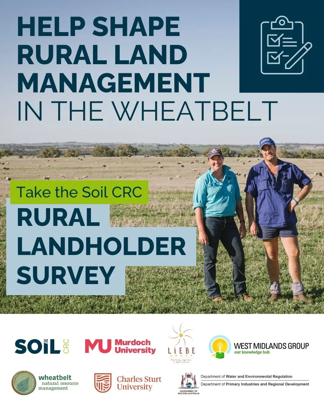This survey is for broadacre farmers in the wheatbelt. Your contribution will provide WA data to nationwide research into how farmers and landholders use their land, their farming practices, their values, goals and challenges and will inform the review of the Regional NRM Plan. Led by Murdoch University, the WA survey is being delivered in collaboration with local partners including Wheatbelt NRM, the West Midlands Group, Liebe Group, the Department of Water and Environmental Regulation (DWER), and the Department of Primary Industries and Regional Development (DPIRD).